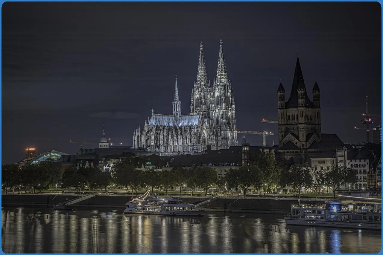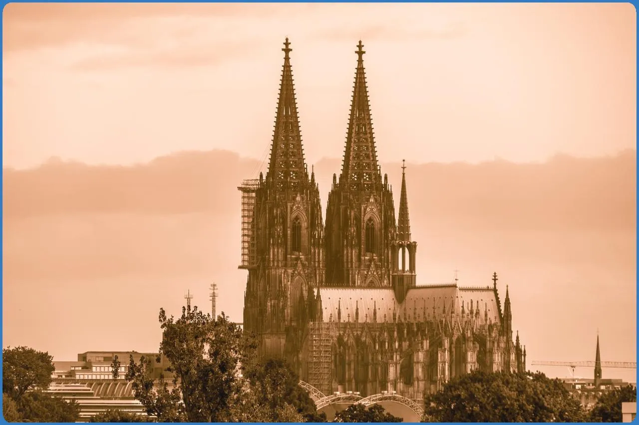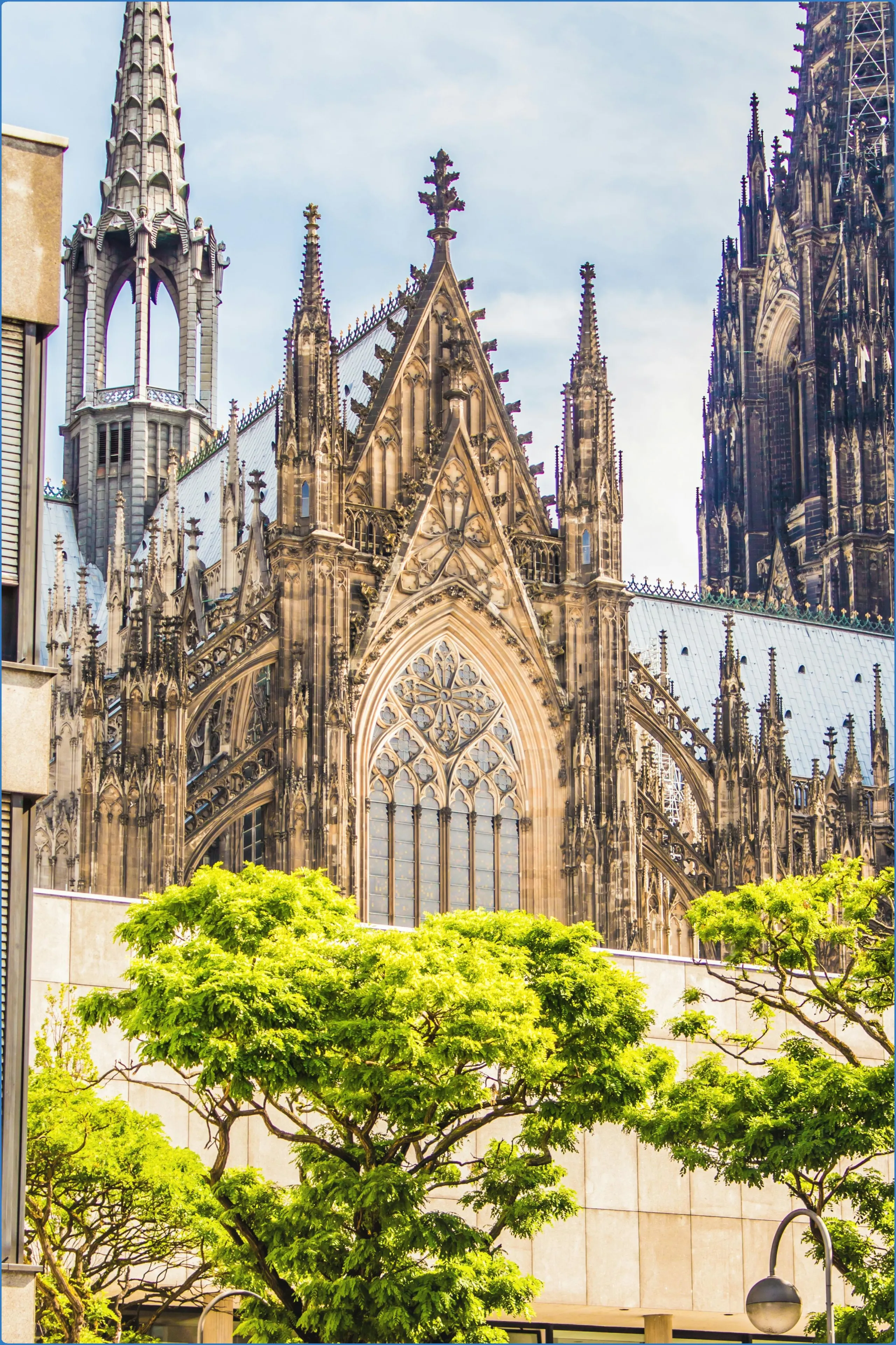 Der Umriss des Kölner Doms ist aus der Ferne sichtbar. Diese Sehenswürdigkeit hat Millionen von Menschen in ihren Bann gezogen, die seine Größe, reiche Geschichte und fesselnde Schönheit bewundern. Er ist ein architektonisches Wunder Europas und ein religiöses Zentrum. Seine schlanken Türme, eleganten Bögen und raffinierten Skulpturen sind Symbole des Mittelalters.