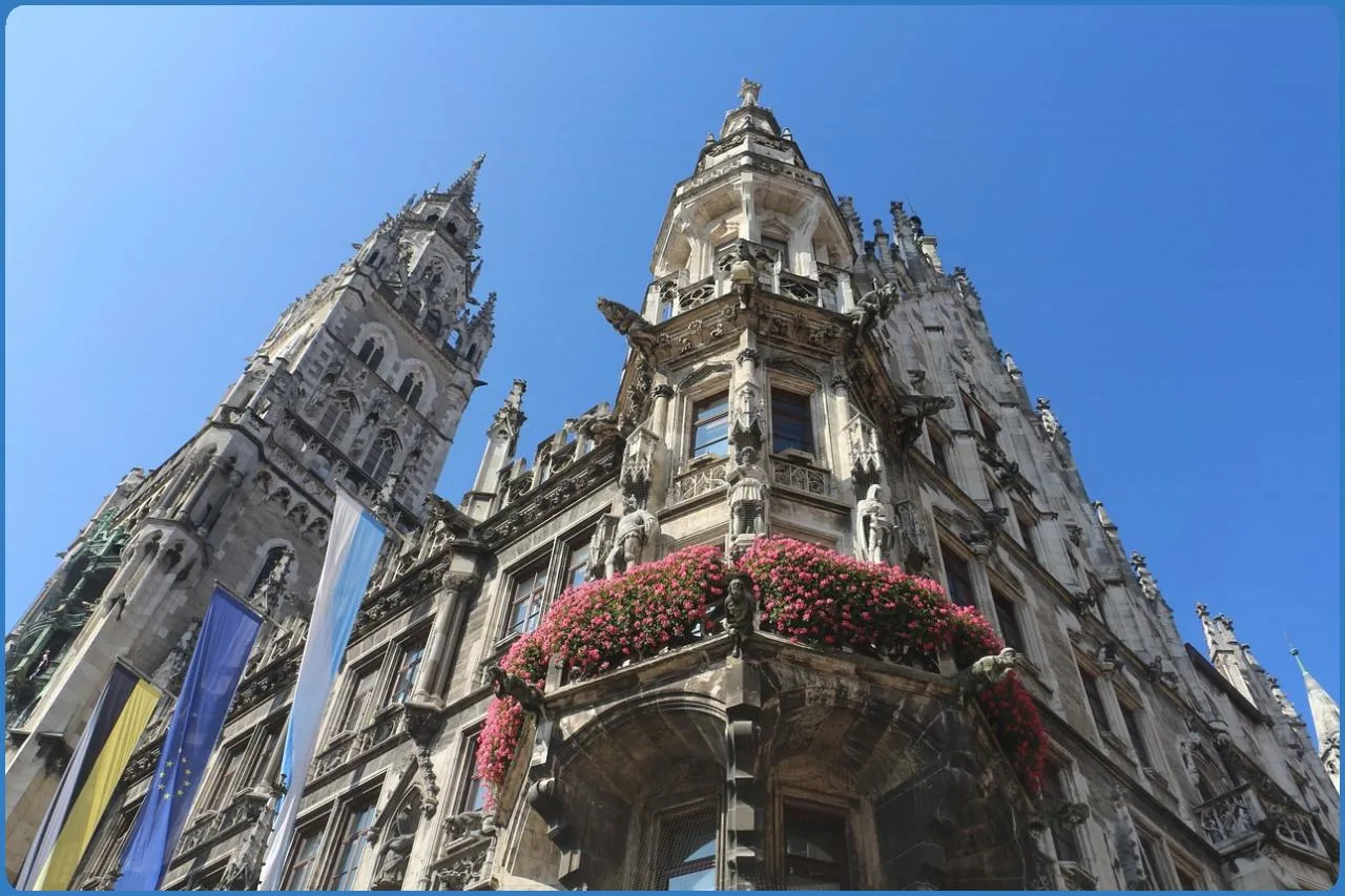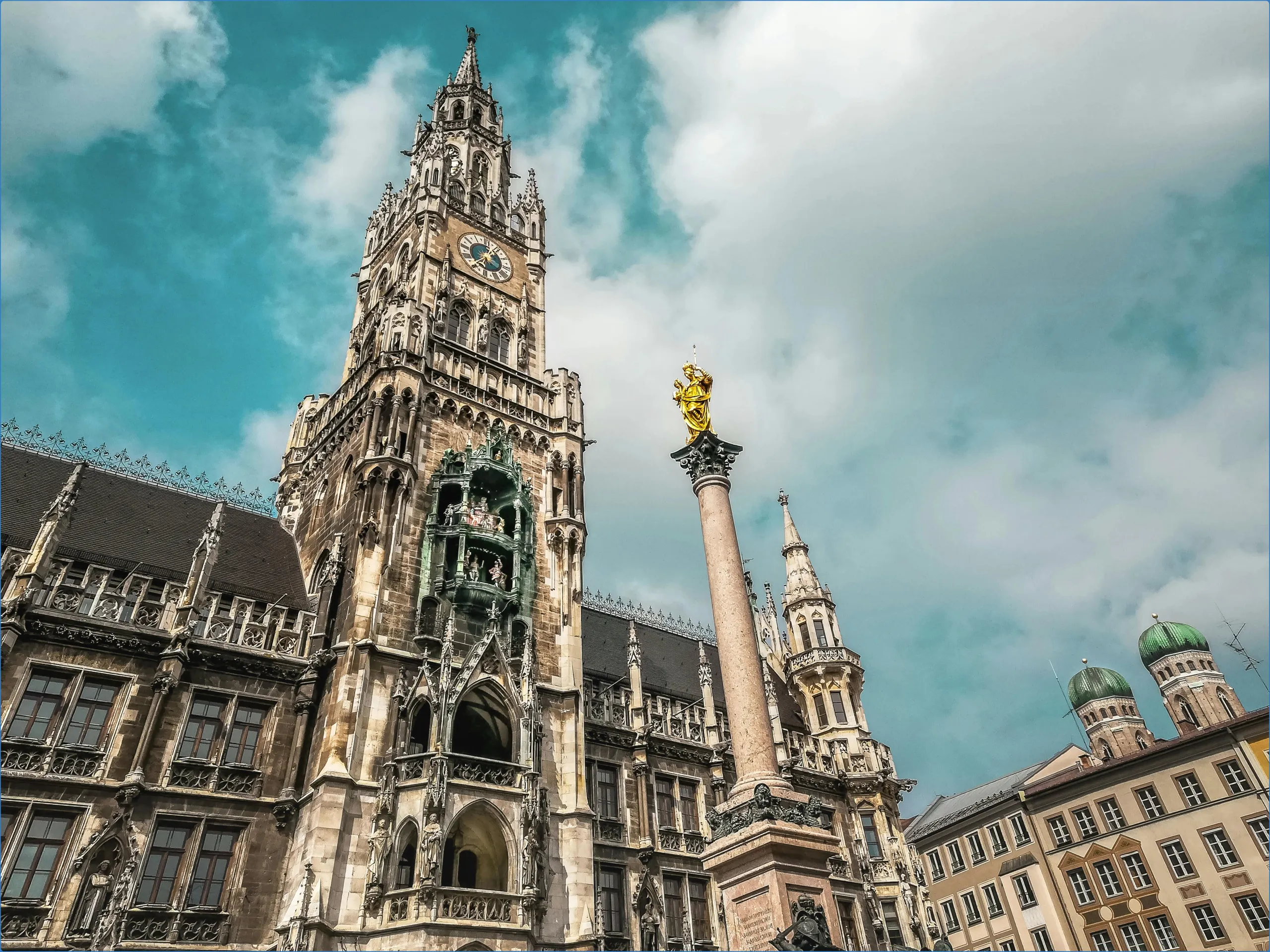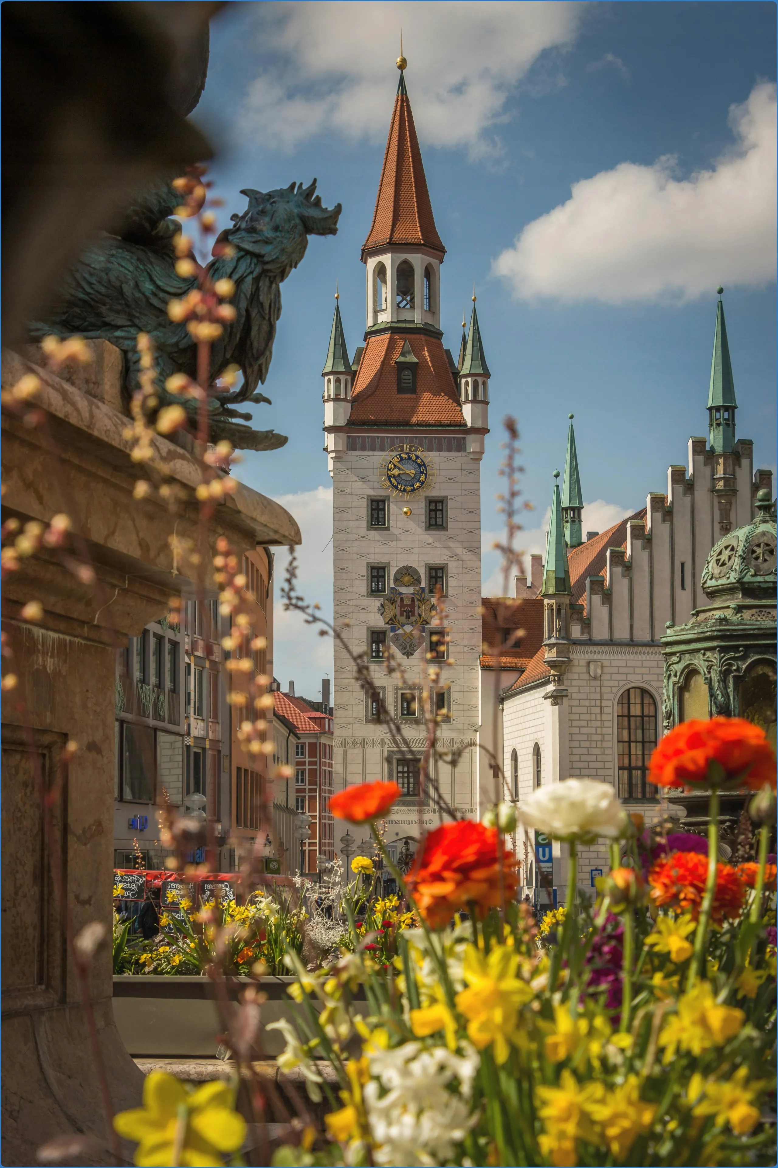 Wenn wir also zum Marienplatz zurückkehren, wird es interessant sein zu wissen, dass sich auf diesem Platz Einkaufszentren und -viertel befinden, wie das Nationaltheater, die Maximilianstraße, das Residenztheater, das Münchner Kammerspiel, das Hofbräuhaus und die Frauenkirche. Und der unvergleichliche Christkindlmarkt ist zweifellos eine der beliebtesten Veranstaltungen auf dem Marienplatz. Die meisten Bürgerinnen und Bürger treffen sich am Fischbrunnen, der sich vor dem Haupteingang des Neuen Rathauses befindet. Gleichzeitig ist die beliebteste Attraktion der Stadt das Glockenspiel auf dem Turm des Neuen Rathauses, das 43 Glocken hat. Ebenso können Touristen den Lesesaal der juristischen Bibliothek und den Rathausbalkon am Marienplatz besichtigen. Dieser Rathausbalkon ist weltberühmt für die Meisterschaftsfeiern des Fußballvereins Bayern München. Die ganze Stadt und den Marienplatz kann man vom Turm des Neuen Rathauses oder vom Alten Peter aus sehen. "Der Alte Peter" ist auch eine der interessantesten Sehenswürdigkeiten in München. Außerdem verfügt der Alte Peter über mehr als 300 Stufen.