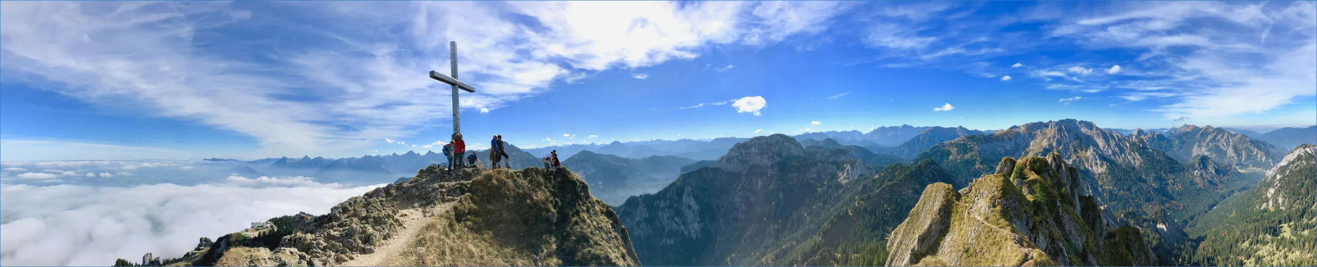 Eine Einkerbung im Berg gibt es kurz vor dem Schlussanstieg zum Gipfelkreuz. Sie gibt einen weiten Blick auf den Forggensee und umliegende Seen frei. Es pfeift hier laut bei Starkwind aus Nord oder Nordwest.