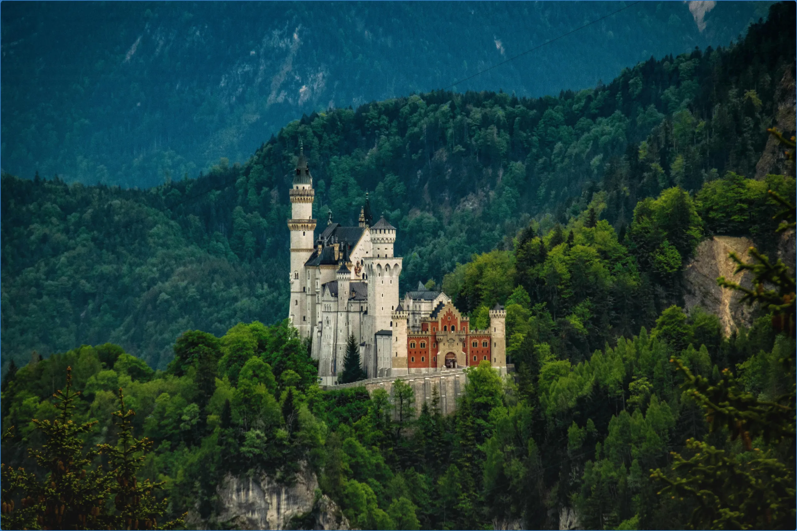 Im Westen an der Pöllat beginnt das Tegelberg-Massiv. Er fließt unter der Marienbrücke hindurch und dann nahe am #schlossneuschwanstein vorbei. Bis auf 1455 m steigt sein Bergrücken von dort Richtung Osten steil an. Einige Zacken und Zinnen gibt es in diesem Bereich. Auf 1587 m steigt etwas weiter östlich davon der Grat am Tegelbergkopf. Die Bergstation der Tegelbergbahn und das Tegelberghaus liegen etwa einen Kilometer weiter östlich auf dem Grat.