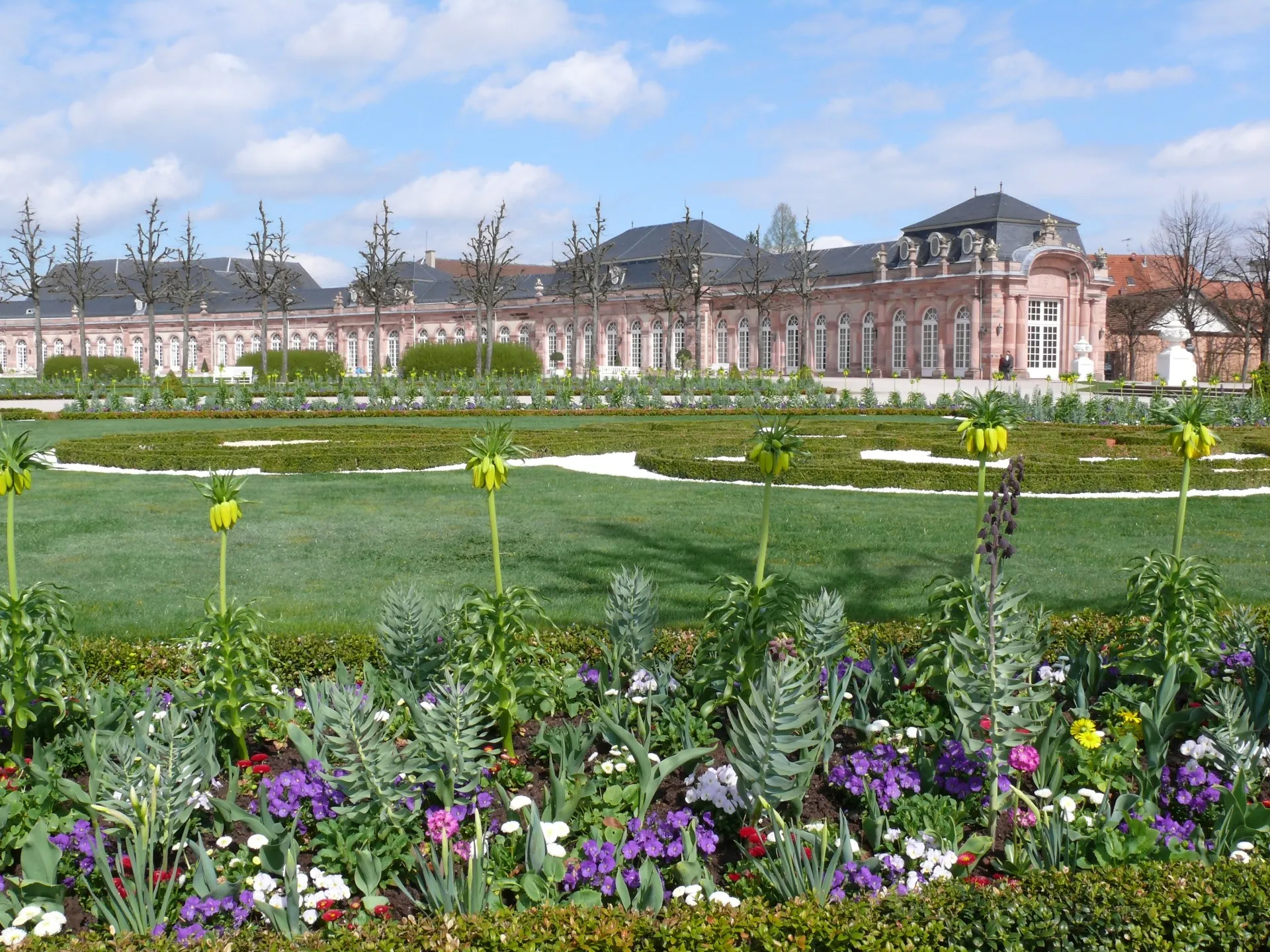 Entlang der Hauptachse des Gartens sieht man westlich des Schlosses die Kalmite im Pfälzerwald und östlich den Königsstuhl im Odenwald. Der Barockgarten ist in strengen geometrischen Formen im französischen Stil angelegt. Der Kreis, die Hauptachse und die Querachse sind die wichtigsten Elemente der Schlossanlage. Gleichzeitig bilden die Boskette und das Parterre den vorderen Teil des Gartens. Auf der Schlossterrasse befinden sich Uhren, die die Epochen der Welt symbolisieren. Auf dem Gelände der Schlossanlage befinden sich auch zwei vergoldete Atlanten, die aus dem früheren Garten stammen. Und das Bild einer Verschaffe-Hirschjagd vervollständigt das französische Tor. Die vier Elemente sind in unmittelbarer Nähe zueinander als Skulpturen abgebildet.