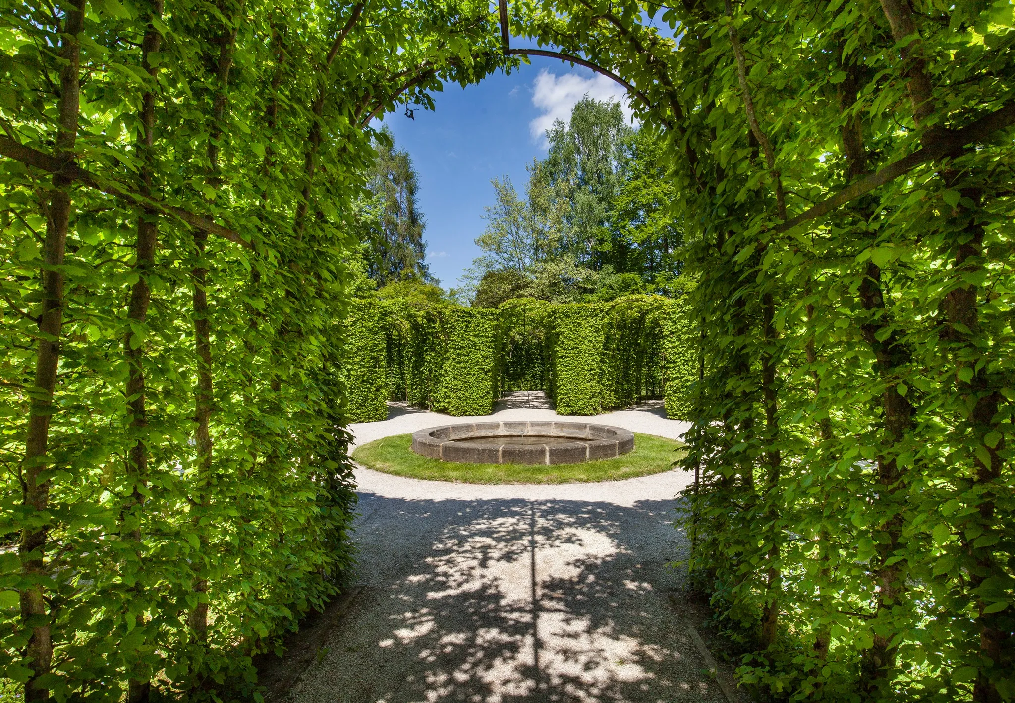 Dahinter ein Hofgarten, genannt französischer Garten, und englischer Art. Das heißt, einer mit formalen, geometrischen Räumen und der andere mit einem natürlicheren, fließenden Stil. Statuen, die an verschiedenen Ecken des Gartens aufgestellt sind, erzählen Geschichten aus der antiken Mythologie und verleihen ihm noch mehr Schönheit.